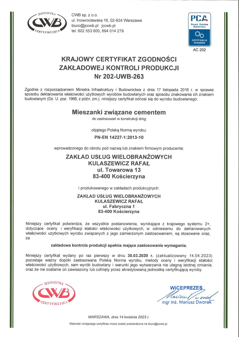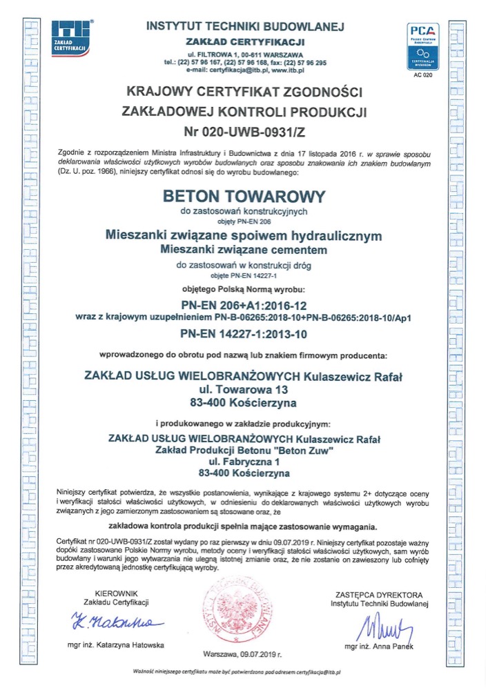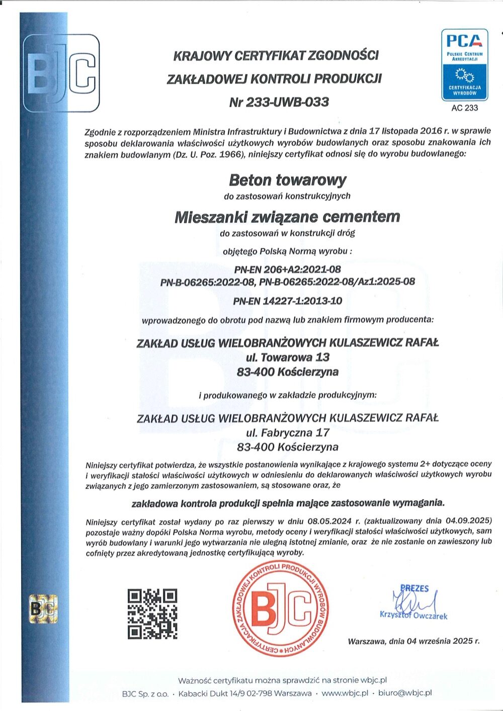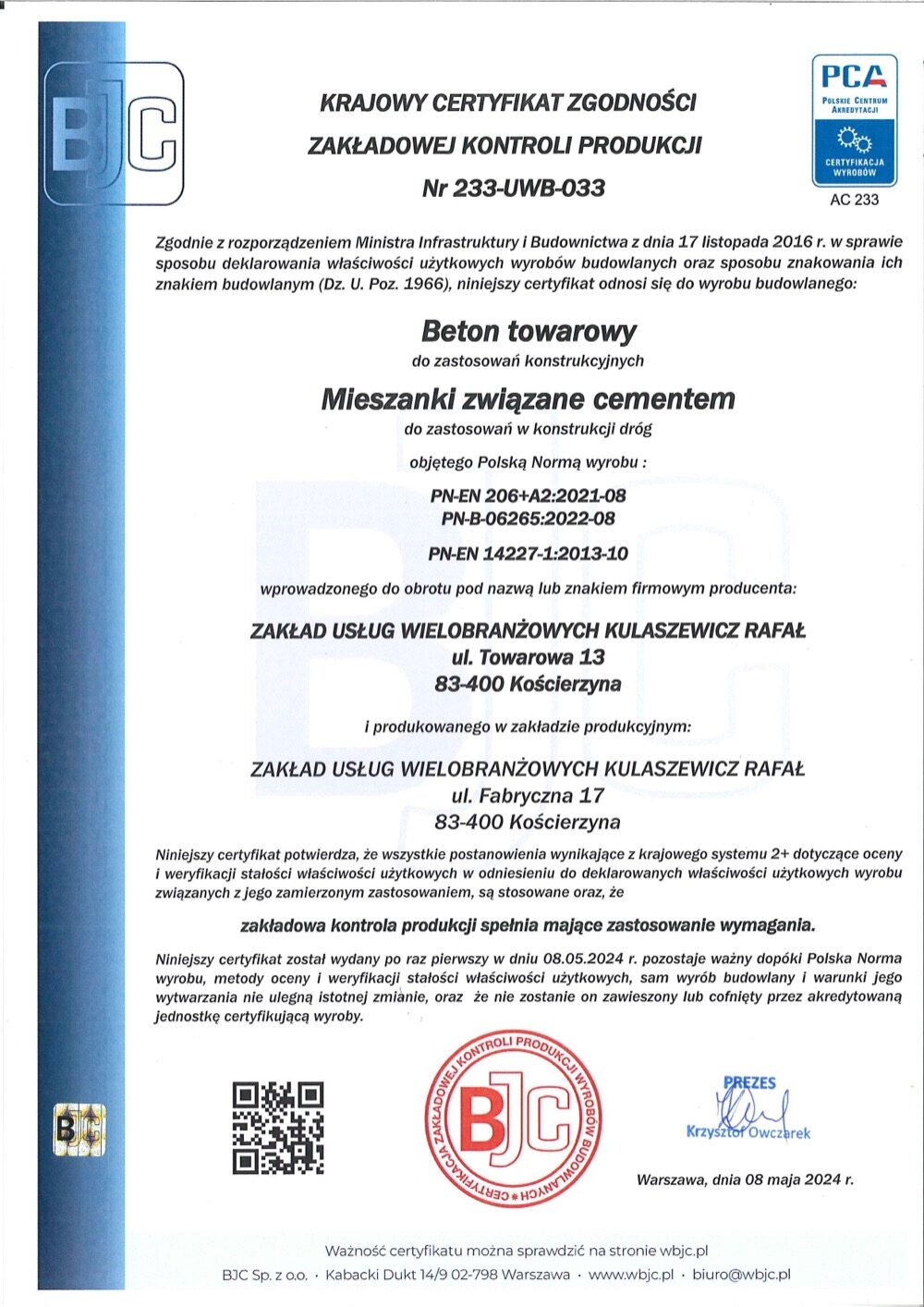 W węźle została wdrożona Zakładowa Kontrola Produkcji oraz certyfikat jakości, dzięki czemu nasze wyroby są monitorowane i badane na każdym etapie – od dostarczanych surowców aż po gotowy produkt.